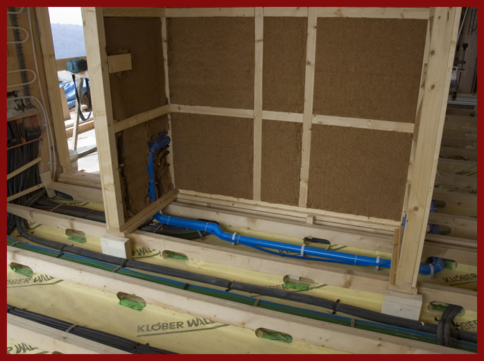 Le pareti interne, divisorie, del sistema Legnolego sono formate da un telaio in legno, montato sopra un profilo di legno a T rovesciata. Il profilo a T, largo quanto lo spessore della parete finita, è dotato di fori per il passaggio degli impianti dal pavimento alla parete ed è fissato sopra i costoloni. Il telaio viene tamponato, sui due lati, con un assito da 25 mm. e successivamente viene coperto da un foglio di cartongesso-fibrogesso e tinteggiato. Dove serve si procede al montaggio della ceramica. In alternativa l’assito di legno può essere sostituito da due pannelli sovrapposti di cartongesso-fibrogesso. Se richiesto, i telai si potranno tamponare con pannelli in lana di legno, mineralizzata, che potrà essere intonacata o finita con terra cruda.